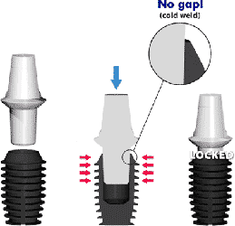 The 1.5 degree tapered post of the Bicon abutment locks into the implant with friction. It is the metal-to-metal contact of the post against the implant wall that makes a secure, reliable, and bacterially-sealed connection.